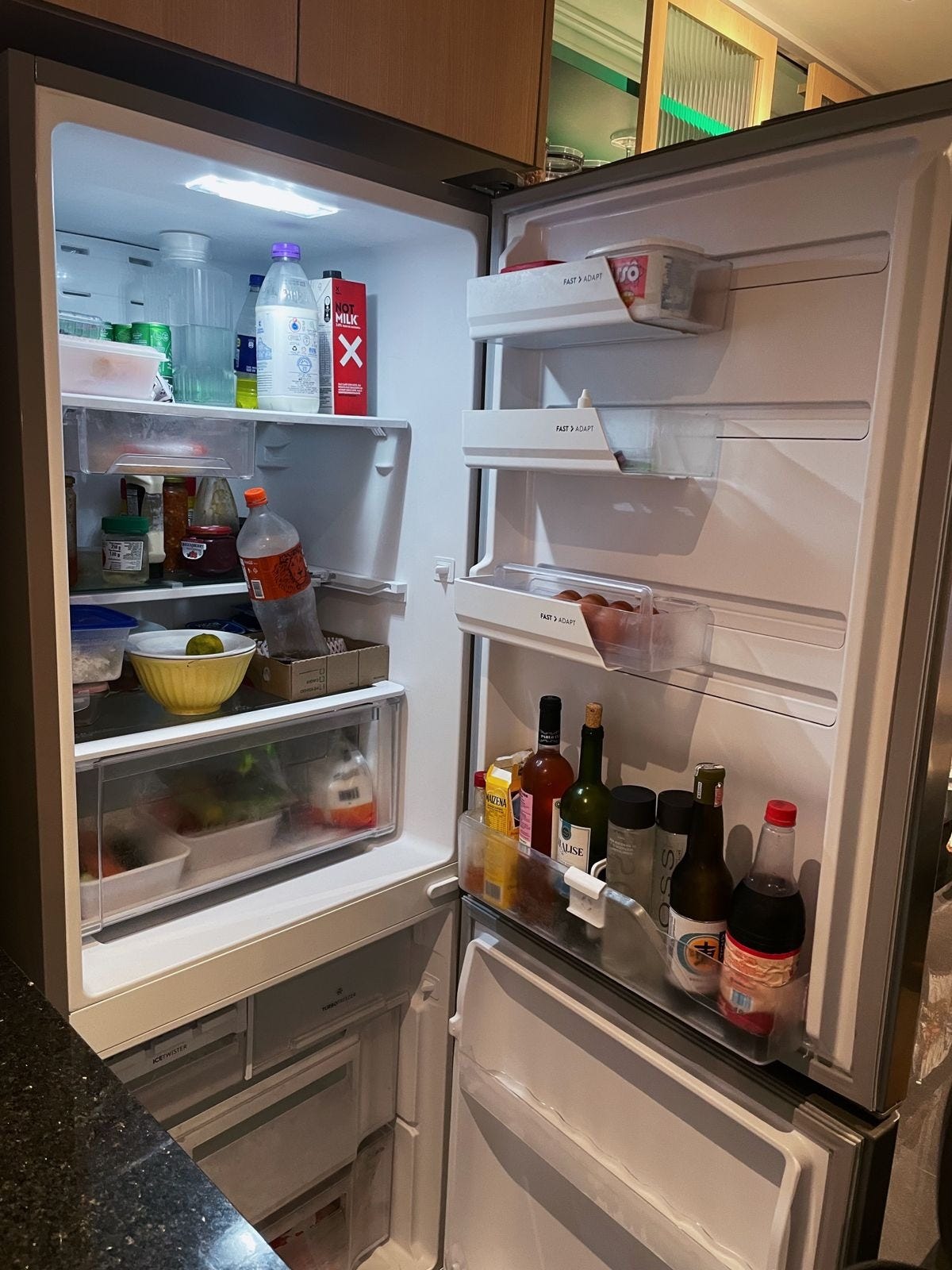 Hoje, pouco mais de 2 anos depois de termos nos mudado para esta casa, nossa geladeira já adquiriu uma personalidade própria e expressa muito de nós, seus “donos" e frequentadores. Meu leite vegetal ao lado do leite integral de meu companheiro. Frutas que não resistem mais ao calor insalubre da cidade, sobretudo as orgânicas, que damos preferência. Ovo, elemento básico e de alto consumo em nossa casa. Verduras como folhas, tomate, cenoura, brócolis - que depois do Cauê descobrir que faz bem para minha endometriose, passou a comprar e me obrigar a comer apesar de eu não gostar de brócolis. Tapioca, geleia sem açúcar, mirtilo e meu pão sem glúten nunca faltam pois comemos todos os dias pela manhã. Uma maionese Hellmann's Supreme que eu comprei de gula por conta da propaganda da marca durante os comerciais das Olimpíadas de 2024. Na porta da geladeira, 2 garrafas de vidro da Voss com água gelada, que geraram uma briga de casal após o Cauê descobrir quanto custa cada uma e saber que eu havia comprado não apenas 1, mas 2. Hoje em dia, ele abre a geladeira e olha para a porta pra ver se eu não comprei uma terceira. Uma garrafa de groselha cheia que provavelmente nunca será tomada em sua totalidade - sequer lembro do contexto que tenha motivado esta compra. Uma garrafa de vinho branco barato para fazer risoto e uma garrafa de vinho rosé que roubei de minha irmã da casa da minha mãe. Uma garrafa de saquê no fim. Maizena e pimenta - essa última inclusive coabita o espaço da geladeira com outras 2 ou 3 variedades dela. As cervejas na prateleira de cima são para as visitas inesperadas e sobretudo para meu suporte emocional - me sinto mais relaxada por saber que ao final do dia posso escolher ou não tomar uma geladinha; embora tente não beber de semana, tem dias que pede. Frutas picadas em potes onde vieram comida italiana via Ifood, uma garrafa de Inka Cola que trouxe do Peru para uma amiga e ela esqueceu em casa, uma garrafa quase vazia de chá que sobrou de uma viagem à praia e ficou conosco, mesmo que tenhamos o hábito de não beber sucos, chás e refrigerantes em casa. Hidrosteril, missô, pasta de pimenta coreana. O congelador quase vazio com algumas carnes, polpa de frutas e pão de queijo congelado. Restos de comidas em potes, um deles de vidro roubado da casa da minha mãe - preciso me lembrar de comprar potes. Iogurte grego que como de pós treino com mirtilo, mamãe e granola.