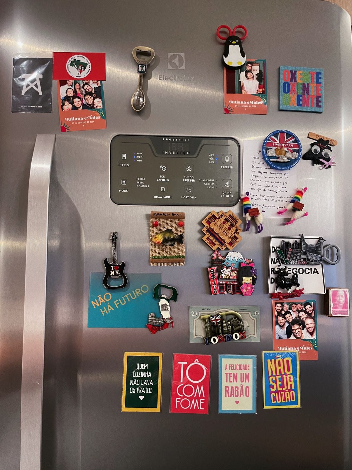 Lembro que, quando nos mudamos para a casa nova em 30 de Outubro de 2022, nossa geladeira tinha apenas uma garrafa d’água e um pote de manteiga. Quando ia para a casa da minha mãe, ficava assombrada com a quantidade e variedade de comida em sua geladeira. Em contraste com a nossa, parecia que éramos adolescentes universitários. Não tínhamos nada pendurado na superfície metálica do eletrodoméstico e logo comecei a pedir de presente dos amigos que iam conhecer nossa casa imãs de geladeira para pendurarmos de recordação. Outros ímãs de viagens que as pessoas foram e nos trouxeram ou de viagens que fizemos. Um deles se destaca por sua feiura e mau acabamento - uma morceguinha de ponta cabeça, grandes olhos e lacinho rosa que trouxemos do Petar e que nos cativou por sua esquisitice. Sabia que dentre outros ímãs bonitos, ela dificilmente seria levada por alguém para casa, por isso trouxe a esquisitona conosco. Nossa geladeira foi um presente de casa nova da família e até hoje não sei para quê servem alguns botões nela. Frostfree inverter com congelador separado. Refrigeração média, modo compras, freezer médio. Ice express, trava painel, turbo freezer, horti vita, drink express - palavras para mim que não fazem nenhum sentido. Quando aberta após algum tempo, ela começa a apitar e nunca descobrimos como desligar este alarme, sendo necessário fechá-la e abri-la novamente, para desgosto da Izaurinha, diarista que trabalha em casa 1 vez por semana, que sempre solta muxoxos por conta deste alarme que a irrita.